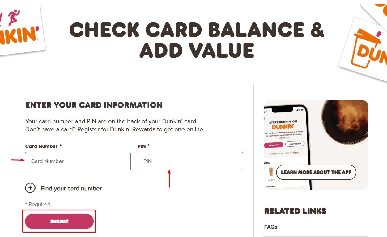 - Visit the official Dunkin’ website’s “Check Balance” page.